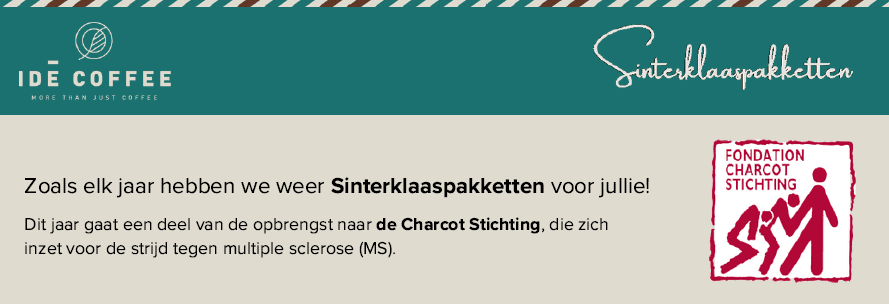 Zoals elk jaar brengt IDE Coffee weer heerlijke Sinterklaaspakketten vol lekkers om het eindejaar op een warme en feestelijke manier in te zetten. Dit jaar krijgt het feest een extra mooie betekenis: een deel van de opbrengst gaat naar de Charcot Stichting, die zich inzet voor baanbrekend onderzoek naar multiple sclerose (MS).